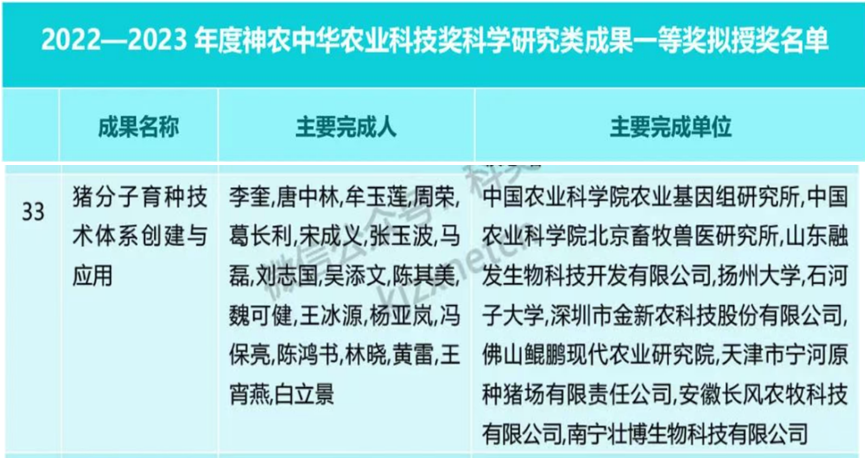 近日,2022-2023年度神农中华农业科技奖正式揭晓。由中国农业科学院农业基因组研究所李奎教授团队领衔,联合多家科研院所与合作企业共同完成的“猪分子育种技术体系创建与应用”项目,荣获科学研究类成果一等奖。