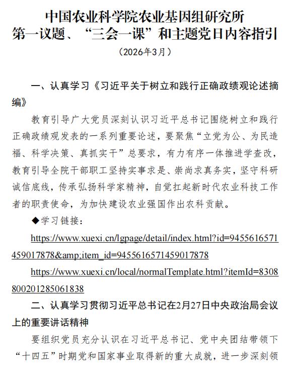 2. 所党委印发《2026年3月第一议题“三会一课”和主题党日内容指引》。16日,所党委印发有关工作指引,供各基层党支部实施参考,帮助各支部明确第一议题、“三会一课”和主题党日的活动主题、把握工作重点,提升组织生活质量,推动基层党支部标准化规范化建设落实落细。