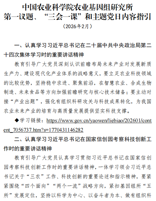 2. 所党委印发《2026年2月第一议题“三会一课”和主题党日内容指引》。10日,所党委印发有关工作指引,供各基层党支部实施参考,帮助各支部明确第一议题、“三会一课”和主题党日的活动主题、把握工作重点,提升组织生活质量,推动基层党支部标准化规范化建设落实落细。