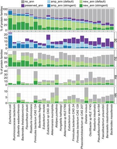 研究团队利用FUGAsseM对“整合人类微生物组计划”(HMP2/iHMP)数据进行分析,成功为超过44万个蛋白家族赋予高置信度功能注释,其中82.3%此前未被表征,且包含3万余个完全新型蛋白家族,这一成果显著拓展了人类肠道微生物的功能图谱。该工具不仅提升了对常见菌(如大肠杆菌、拟杆菌)的泛基因组注释覆盖率,也显著扩展了对难培养或研究不足微生物的功能解析,功能注释覆盖率平均提升近 5倍,展示了跨物种、跨生态系统的普适性与可拓展性。
