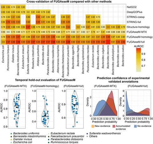 FUGAsseM在交叉验证中展现出卓越表现:仅基于宏转录组的模型已可达到平均AUROC 0.71,而整合多类证据后,AUROC高达0.95,媲美甚至优于当前单菌方法如DeepGOPlus与NetGO2.0等。与单菌株实验对照相比,它在全新、未知功能蛋白的预测中展现出更强适应性。这表明FUGAsseM不仅是概念上的方法创新,更是一款具备直接应用价值的高通量功能预测方法。