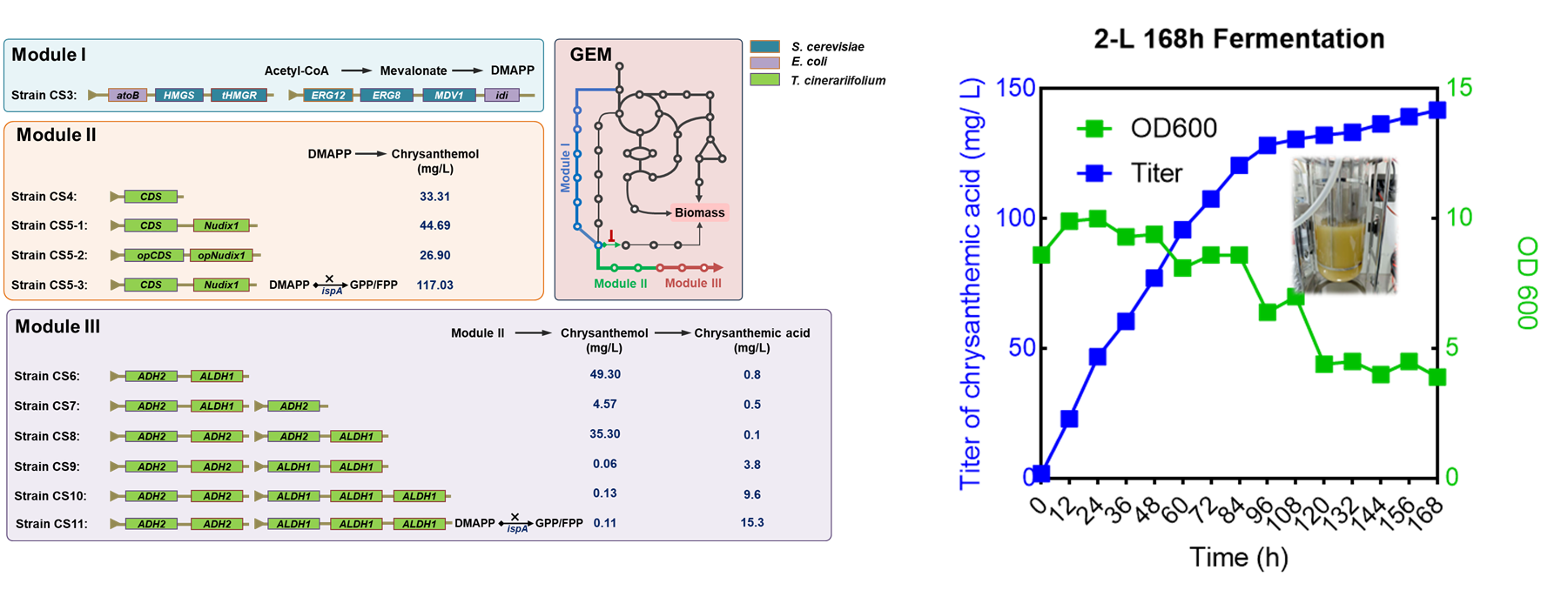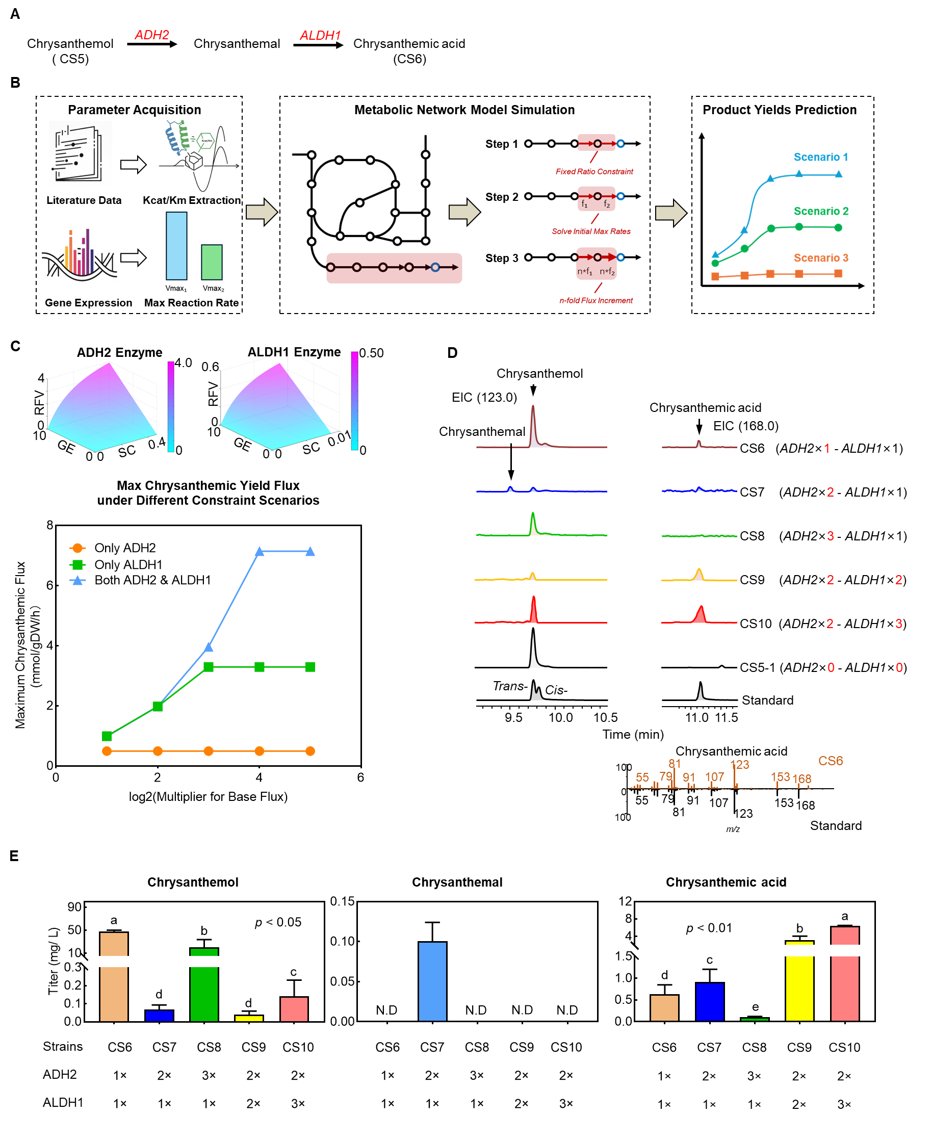 研究团队首先在工程菌中构建了除虫菊酸的合成通路,发现目标产物的前体物质大量流向副产物。通过基因组尺度代谢模型作为“代谢导航系统”,研究人员精准定位到关键分流点,模拟分流途径流量变化与目标产物产量的关系,并采用小RNA技术抑制关键分流点活性,使得中间产物除虫菊醇的产量提升2.6 倍。