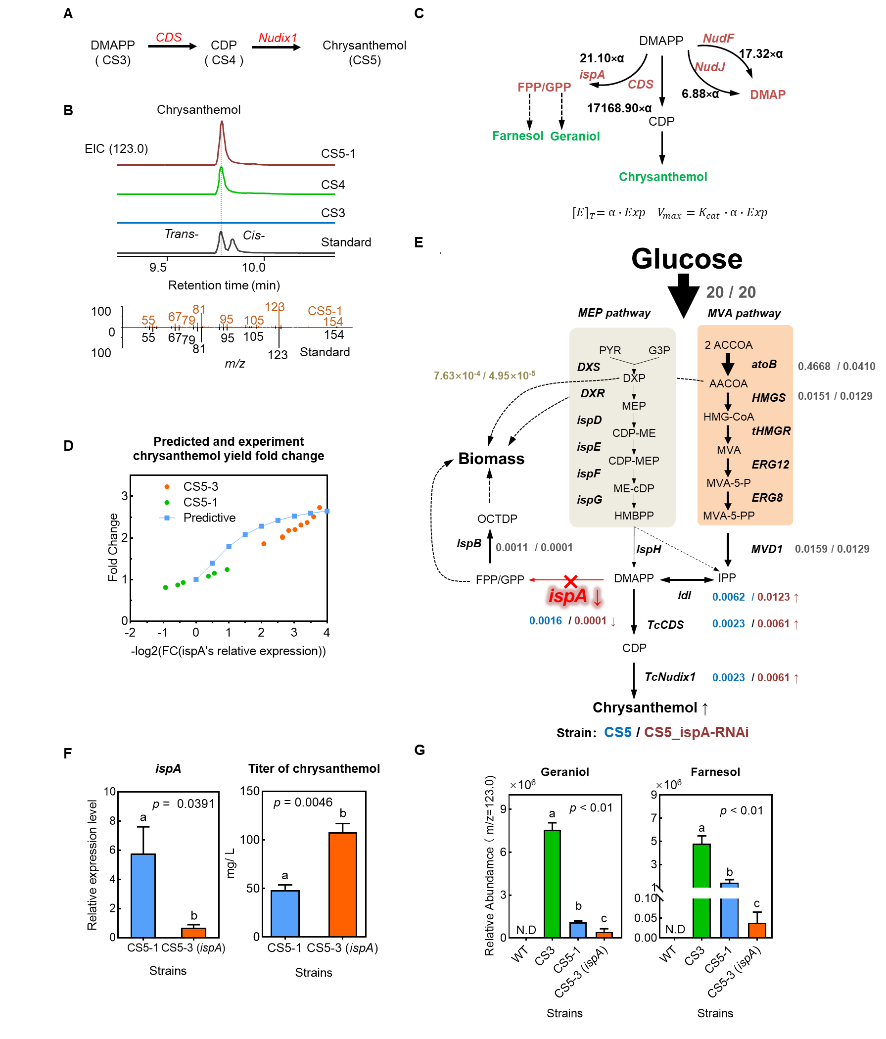 近日,中国农业科学院深圳农业基因组研究所(岭南现代农业科学与技术广东省实验室深圳分中心)李伟课题组联合赵程课题组在《先进科学(Advanced Science)》上发表题为“Genome-scale metabolic modeling guided Escherichia coli engineering for de novo biosynthesis of chrysanthemic acid”的研究论文。该研究利用“人工智能+基因组规模代谢网络模型(GEM)”的设计思路,成功将大肠杆菌改造为高效的“细胞工厂”,实现了天然农药除虫菊酸的高效微生物合成。