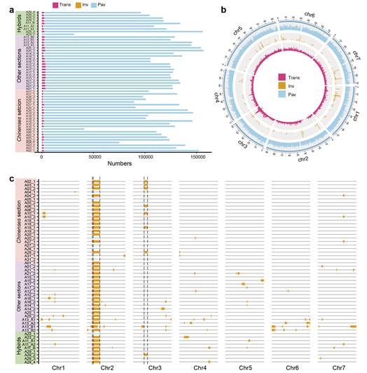基于55个高质量泛单倍型基因组,本研究首次在单倍型水平下系统构建了月季种质间的泛变异精细图谱,共获得1,738,269个非冗余存在/缺失变异(PAVs)、1,567个倒位和61,701个易位。在此基础上,构建了月季倒位变异图谱,揭示倒位变异可介导功能基因缺失,从而影响相关性状。进一步分析发现,约70%的变异与转座元件(TEs)相关,表明TEs在结构变异的形成与扩增过程中发挥重要作用。