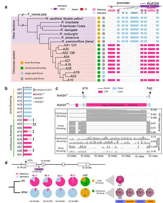 基于构建的高质量月季泛变异图谱,整合结构变异与转录组数据,本研究系统解析了月季重要观赏性状的遗传调控机制。在连续开花性状中,发现Chinenses组种质在3号染色体上存在特有倒位,且该倒位与调控持续开花的RcKSN基因缺失高度连锁;群体关联分析进一步鉴定出4个与连续开花显著相关的关键SNP位点。该特有倒位与关键 SNP 位点的联合鉴定,为阐释 Chinenses 组连续开花性状的演化与遗传调控提供了新依据。在重瓣性状中,转座子插入介导的AP2L表达调控机制特异存在于Chinenses组,而其他蔷薇亚属种质中还存在不同调控方式。此外,在花瓣变色性状中,功能关联分析表明CCD4基因在中国古老月季“蝴蝶”中呈现特异表达延迟,导致β-胡萝卜素降解滞后,从而促使花瓣出现短期橙色,随后由橙向红转变;其启动子中光响应元件等差异可能调控该表达模式。综上,本研究从分子层面阐明了月季关键观赏性状的遗传机制,为花色、花型及花期的分子设计育种提供了重要靶标与基因资源。