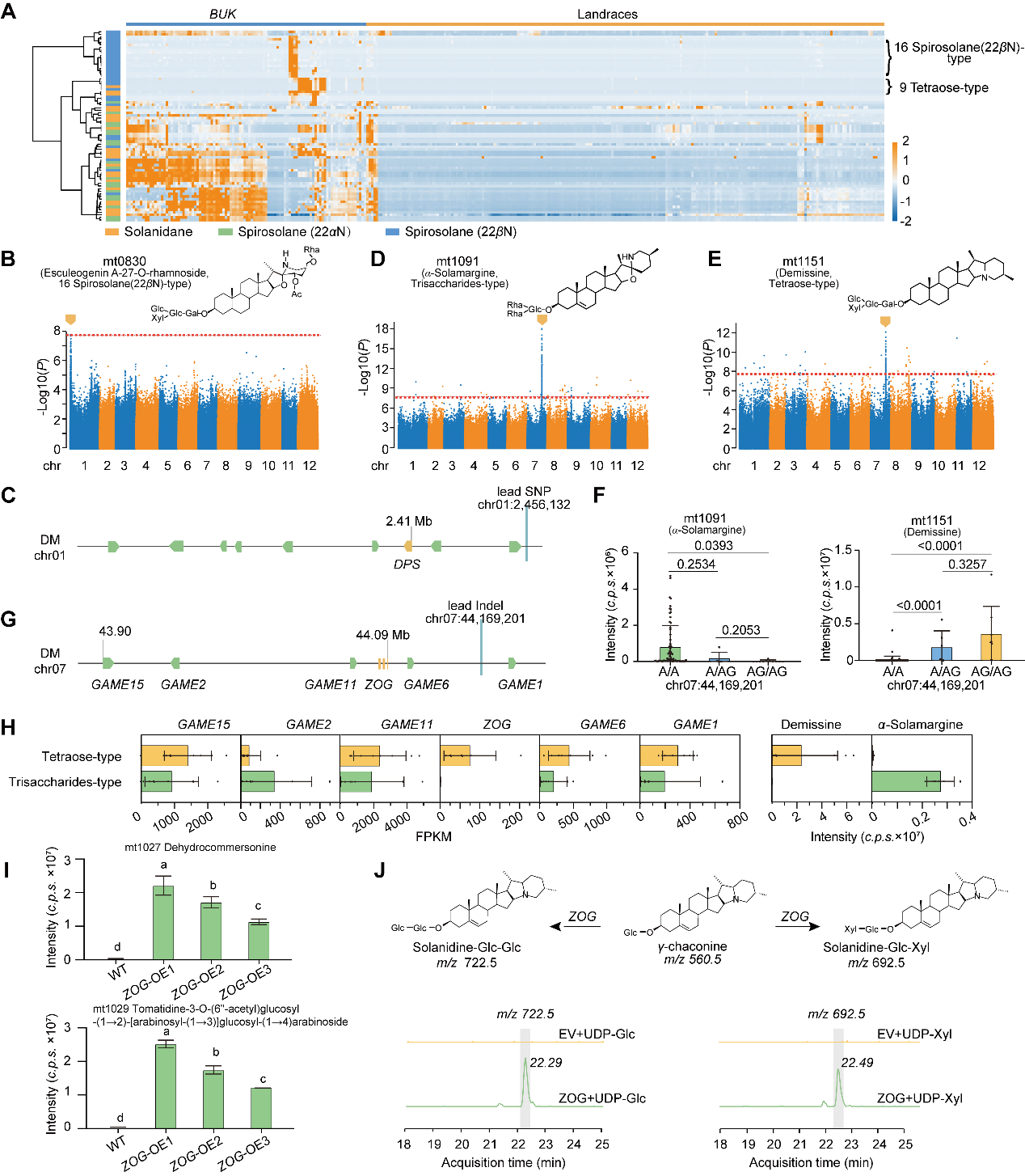 通过代谢组全基因组关联分析,团队鉴定出 2046 个与 568 种代谢物相关的遗传位点,揭示了代谢重塑的核心遗传机制。研究发现,两个关键合成基因(DPS 和 ZOG)的编码区变异影响 SGA 的结构多样性,而转录因子GAME9 和 MYB13 的顺式调控区变异则通过降低基因表达,显著减少了块茎中 SGA 的积累。这种 “编码区变异影响结构、调控区变异控制含量” 的遗传选择,既保证了马铃薯的食用安全性,又保留了其在非食用部位的防御功能。