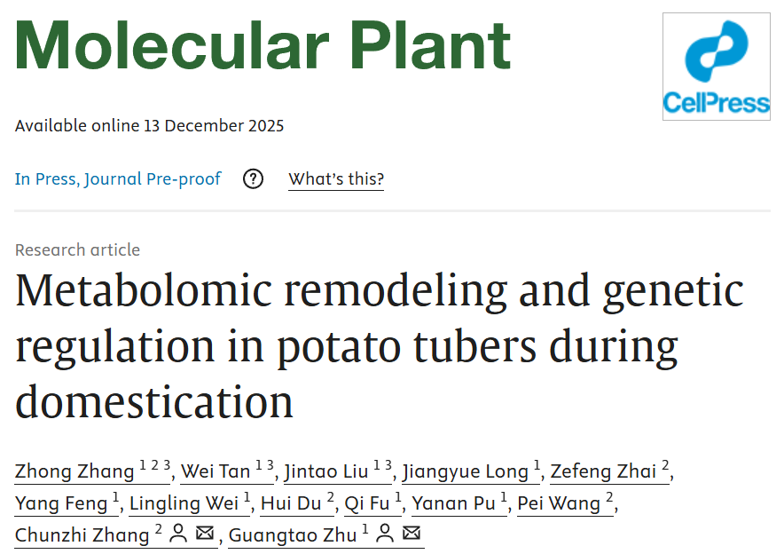 12月13日,中国农业科学院深圳农业基因组研究所(岭南现代农业科学与技术广东省实验室深圳分中心)张春芝课题组联合云南师范大学在《分子植物(Molecular Plant)》上发表题为“Metabolomic remodeling and genetic regulation in potato tubers during domestication”的研究论文。该研究通过多组学技术系统解析了马铃薯块茎从野生祖先到栽培地方品种的代谢重塑过程及遗传调控机制,为培育风味更佳、营养更丰富的马铃薯新品种提供了关键理论支撑和基因资源。