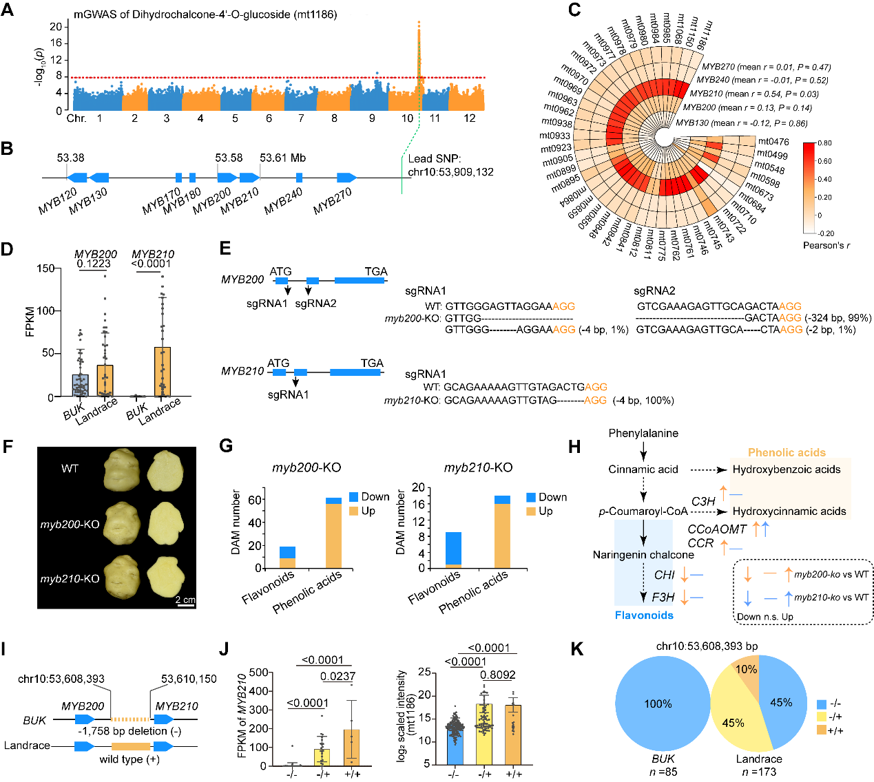 研究还鉴定两个串联排列的 MYB 转录因子(MYB200 和 MYB210),它们通过调控苯丙烷代谢流的分配,促进类黄酮合成并抑制酚酸积累。有趣的是,早期农民对彩色块茎的选择,意外推动了类黄酮含量的提升,体现了人工选择的 “附带效应”。