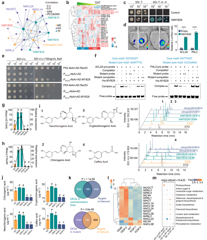 图3|NtMYB28调控羟基肉桂酸生物合成及苯丙烷途径相关基因的表达