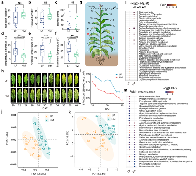为了精准解析自然环境中烟草的代谢调控规律,研究团队选择了中国两个生态差异显著的典型烟草种植区—高海拔山区(HM)和低海拔平原区(LF)开展田间试验。通过对两地气候数据的系统分析,发现温度是影响烟草生长和代谢稳态的关键环境因子,两地在温度范围、平均温度和最高温度上存在极显著差异,而这种差异为后续构建稳定可靠的代谢调控网络提供了理想的环境扰动条件。