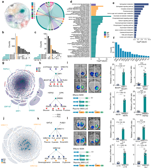 为了从多维角度处理和分析这些海量的组学数据,研究团队首先通过加权基因共表达网络分析(WGCNA)、皮尔逊相关系数(PCC)分析和 k-means 聚类等方法筛选核心调控关系,再结合基尼系数(GINI)和随机森林捕捉非线性调控关联,最终成功将 25984 个基因和 633 个代谢物映射到 了317 万条高置信度调控对,从而构建出首个烟草全基因组代谢调控网络(GMRN)。ERF、WRKY 和 MYB 家族是调控网络中最核心的转录因子家族,为验证网络的可靠性,团队针对 ERF 和 WRKY 家族转录因子构建了调控子网络。以 ERF为例,网络中排名前五的高连接度 ERF 转录因子中,ERF1 和 DREB3 的调控功能与已报道研究完全吻合,且通过双荧光素酶实验证实,ERF1 可激活脂质转运蛋白基因 BCCP1 和过氧化物酶基因 POD1 的表达,DREB3 则能正向调控单糖转运蛋白基因 MST6,证明了该调控网络的准确性和实用性。