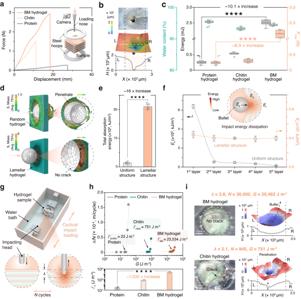 在力学性能方面,片层结构显著提升了材料的耐冲击能力。准静态穿刺实验和力学模拟表明,BM水凝胶在受冲击时能够将局部载荷分散到多层结构中,单层能量耗散量较均质对照材料提高约16倍(图3a–f)。更为关键的是,在湿态下循环冲击测试中,BM水凝胶展现出接近昆虫表皮的耐冲击特性,其抗冲击疲劳阈值相对于蛋白水凝胶和几丁质水凝胶分别提高约1032倍和31倍(图3g、h)。在超过30000次循环冲击后,BM水凝胶整体结构仍保持完整,而对照组水凝胶已相继失效(图3i),从实验与模拟两个层面印证了片层结构与多尺度能量耗散机制在构筑超高耐冲击性能中的关键作用。