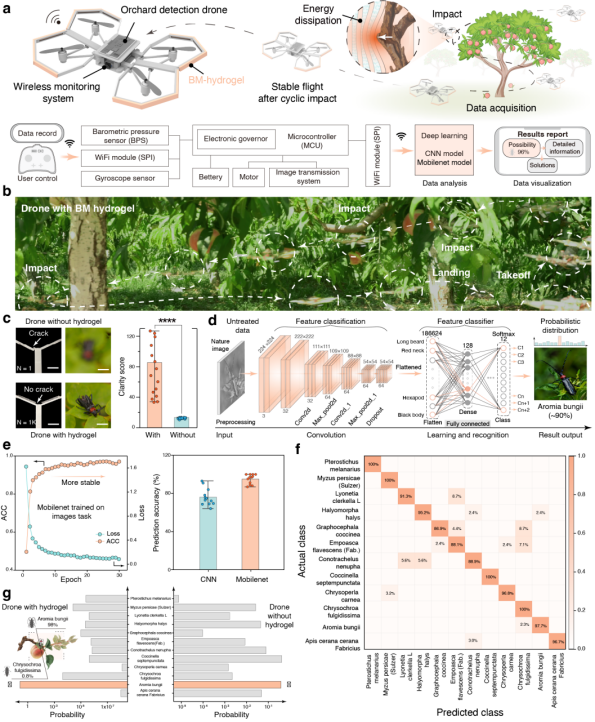 最后,研究团队将仿生耐冲击BM水凝胶装配到农业害虫侦查无人机防撞支架上,构建“防撞+识虫”一体化平台(图5a)。在森林果园等布满树枝和障碍物的复杂环境中,以约4 m/s 进行连续碰撞飞行测试时,未装配BM水凝胶的无人机在首次碰撞后即失稳下坠、支架受损,而装配仿生耐冲击BM水凝胶的无人机仅出现短暂姿态波动后便恢复稳定飞行,机体结构完好,整体图像清晰度得分提高至85.4±33.0,约为裸机的6倍(图5b、c)。在此基础上,研究者利用碰撞工况下采集的图像训练并验证卷积神经网络和轻量化MobileNet V2模型,结果表明在多类果树害虫识别任务中仍保持较高识别准确率与鲁棒性(图5d-g),进一步证明该BM水凝胶在频繁撞击和强干扰环境下既能有效保护机体,又能保障数据质量和识虫性能。