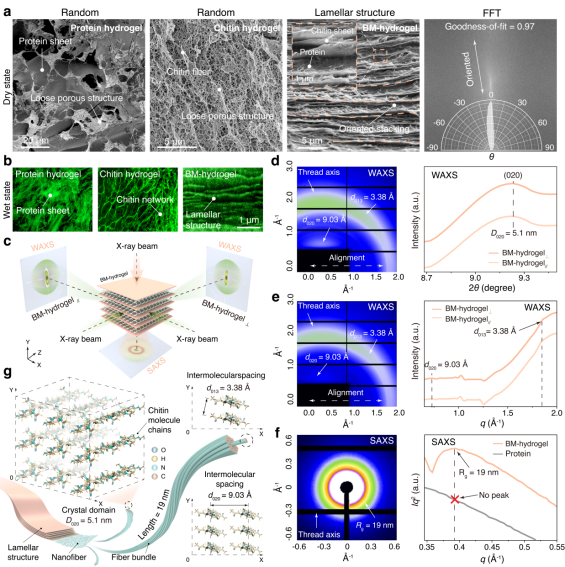在结构层面,研究揭示了仿生耐冲击BM水凝胶中层状结构的形成机制(图2)。纯几丁质呈纤维网络、纯蛋白呈松散结构,而二者在OfCPH-2的调控下可协同自组装成致密、取向良好的多级层片。激光共聚焦成像与X射线散射证实,这些层片在湿态下依然保持高度有序,晶体尺寸、层间距与取向度均显著提升,呈现类似昆虫表皮的精细排布(图2b-g)。进一步分析发现,蛋白的多位点弱结合填补了几丁质微纤维间的空隙,促进其在低浓度条件下也能规律堆叠,形成稳定层状骨架。正是这种“蛋白调控几丁质有序化”的协同效应,为后续卓越的耐冲击性能奠定了结构基础。