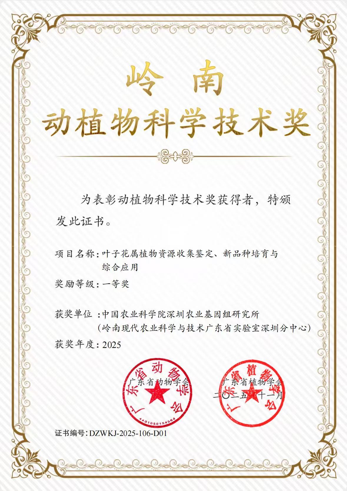 近日,广东省动物学会、广东省植物学会公布了2025年度“岭南动植物科学技术奖”获奖项目名单。由中国农业科学院深圳农业基因组研究所(岭南现代农业科学与技术广东省实验室深圳分中心)牵头,联合中国热带农业科学院热带作物品种资源研究所、华南农业大学、仙湖植物园、深圳市公园管理中心、深圳市花卉协会、深圳市绿源坊园林花卉有限公司等多家单位共同完成的“叶子花属植物资源收集鉴定、新品种培育与综合应用”项目,荣获岭南动植物科学技术奖一等奖。该项目由基因组所(大鹏湾实验室)武志强研究员牵头主持。